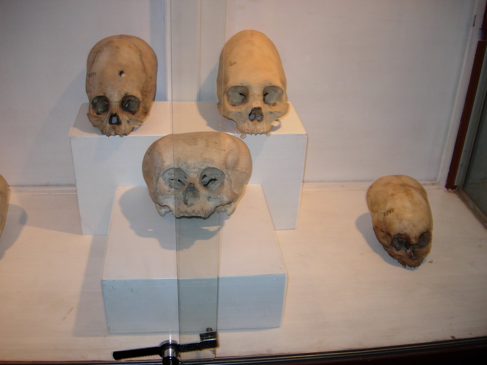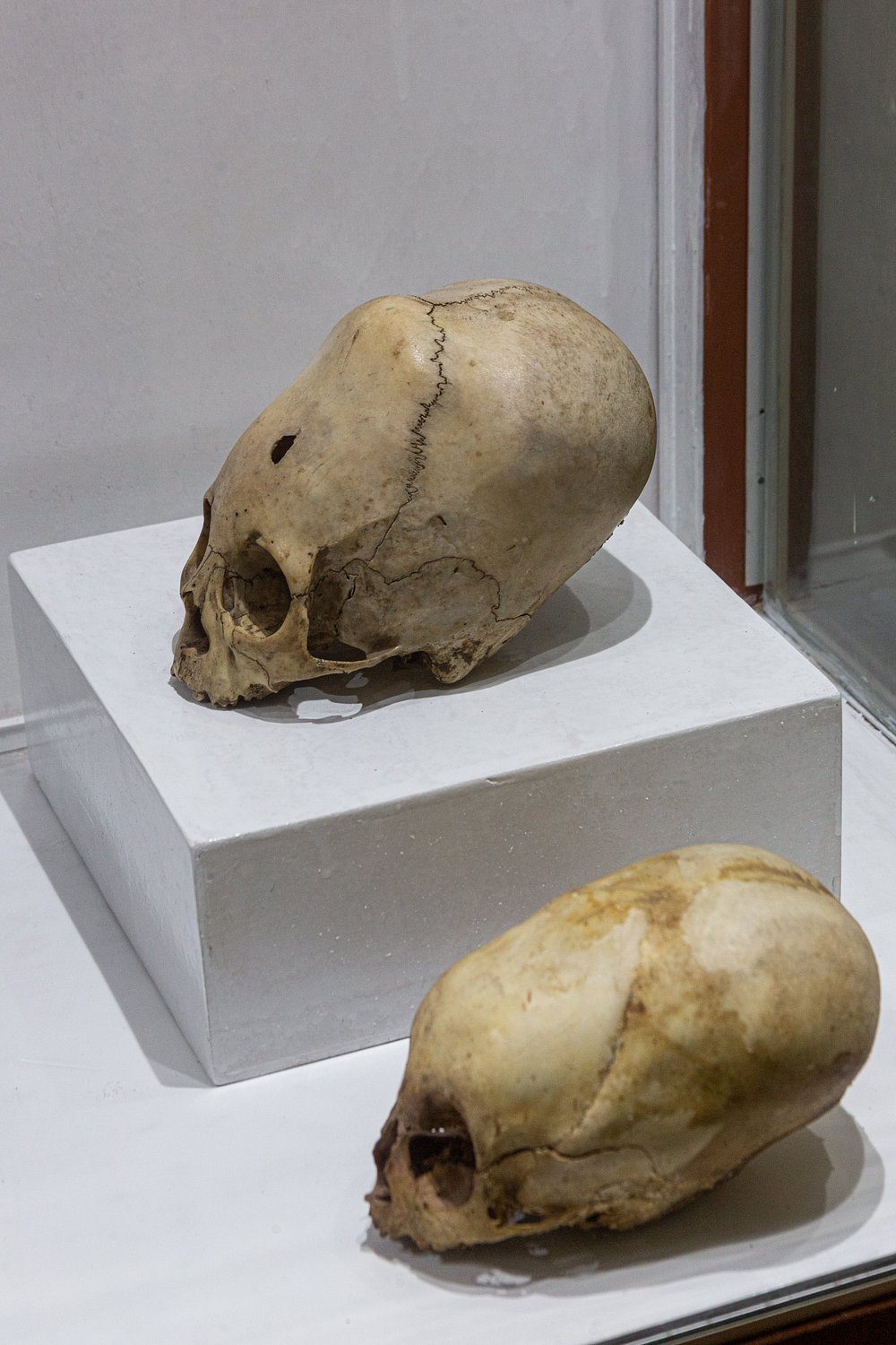 This section displays skulls with intentional cranial deformation and trepanation, revealing advanced medical knowledge. These practices were linked to social status, healing, and spirituality.