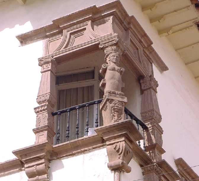 The striking corner ajimez balcony — an architectural element of Arab origin (aš‑šammīs, “exposed to the sun”) — overlooks the historic streets below. Embedded within its design is an androgynous, bifront figure, interpreted as a solar manifestation aligned with the winter solstice.